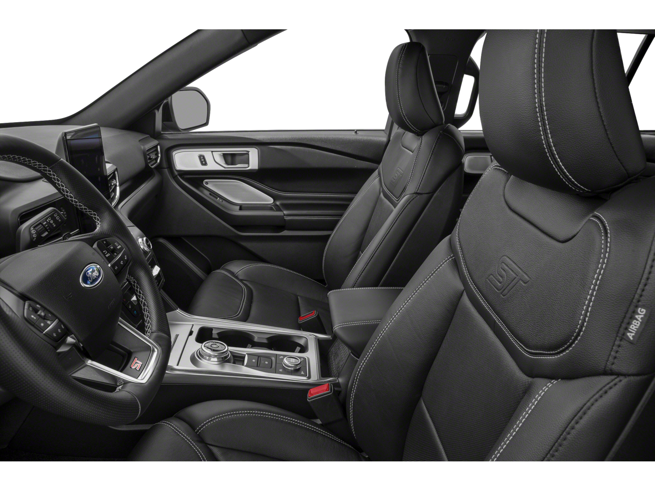 The Explorer ST's striking exterior commands attention with its bold design cues, including a muscular front grille, sleek LED lighting, and exclusive 21-inch aluminum wheels. Step inside and you'll be enveloped in a cabin that exudes refinement, with premium leather upholstery, brushed aluminum accents, and a 10.1-inch touchscreen display that puts the latest connectivity and entertainment features at your fingertips.