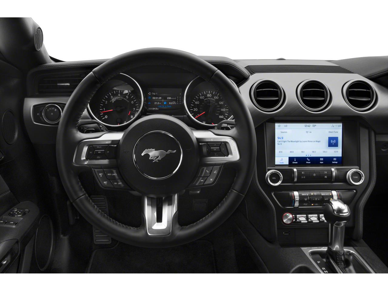 The Mustang's striking exterior design commands attention wherever you go. The bold front grille, sleek profile, and distinctive rear spoiler give this sports car an undeniably athletic presence. Step inside the cabin, and you'll be greeted by premium leather-trimmed bucket seats, a leather-wrapped steering wheel, and a host of advanced technology features.