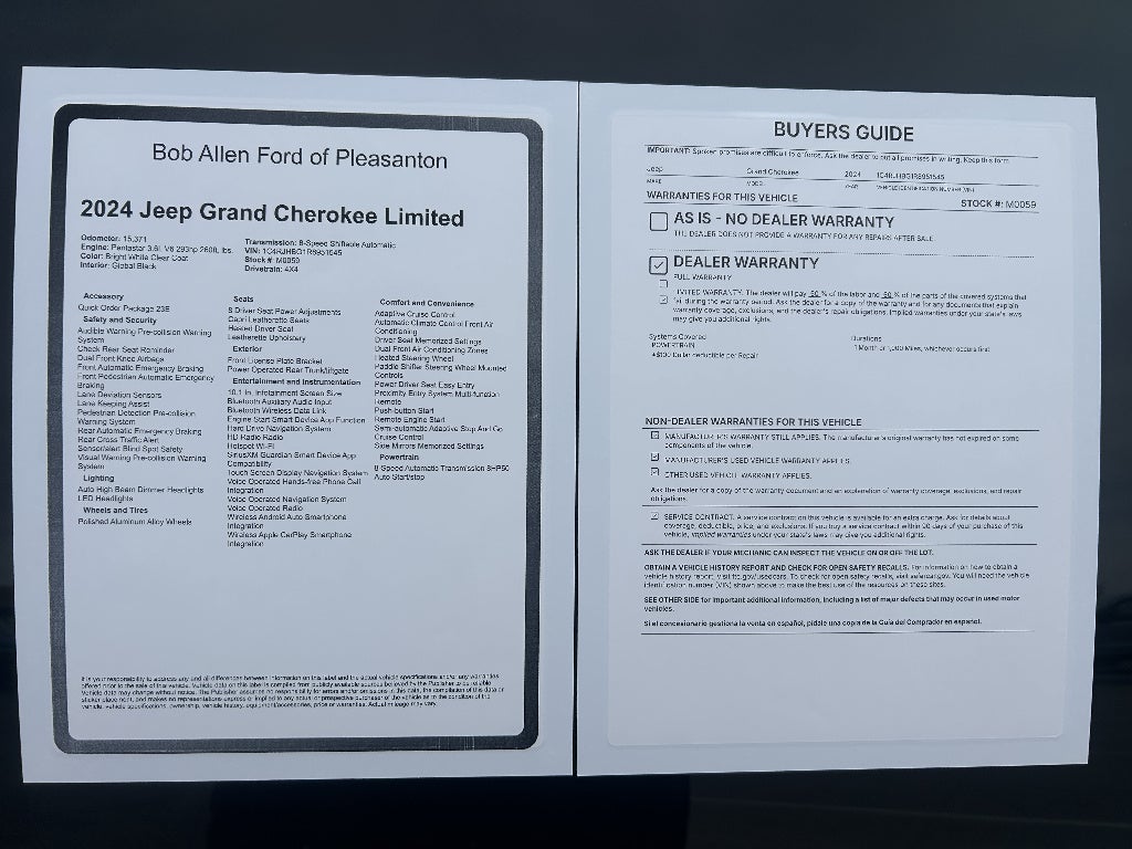 Experience the perfect blend of luxury, technology, and capability with this White 2024 Jeep Grand Cherokee Limited 4x4. Designed for comfort and adventure, this SUV features a powerful Pentastar 3.6L V6 engine paired with an 8-speed automatic transmission and full-time 4WD. Stay connected and in control with the Uconnect infotainment system, 10.1-inch touchscreen, wireless Apple CarPlay and Android Auto, and built-in navigation. Enjoy peace of mind with advanced safety features like adaptive cruise control, lane keeping assist, blind spot monitoring, front and rear automatic emergency braking, and rear cross traffic alert. Indulge in comfort with Capri leatherette seats, heated front and rear seats, heated steering wheel, and dual-zone automatic climate control. Convenience features include remote engine start, power liftgate, proximity key entry, and a customizable digital instrument cluster. Whether you're commuting or exploring off-road, this Grand Cherokee delivers the versatility and refinement you expect from Jeep. Schedule your test drive today! Call us at (913) 352-8521 to schedule your test drive on this Bright White Clear Coat 2024 Jeep Grand Cherokee Limited. From the comfort of your home you can shop, get pricing, and trade value. We will deliver your vehicle and paperwork.